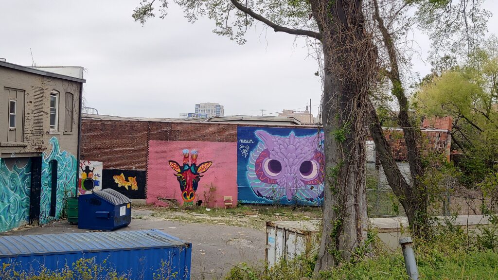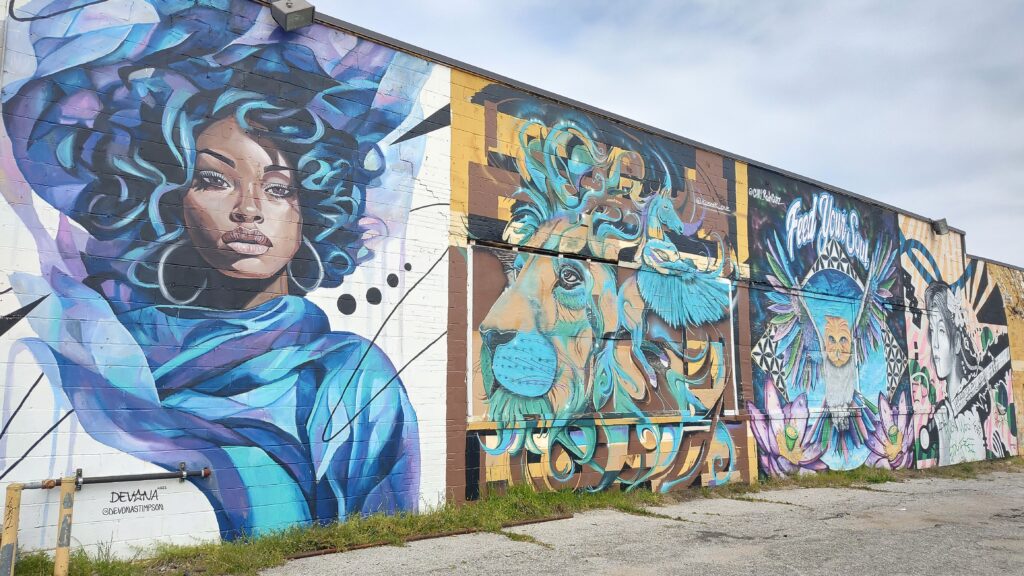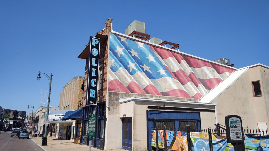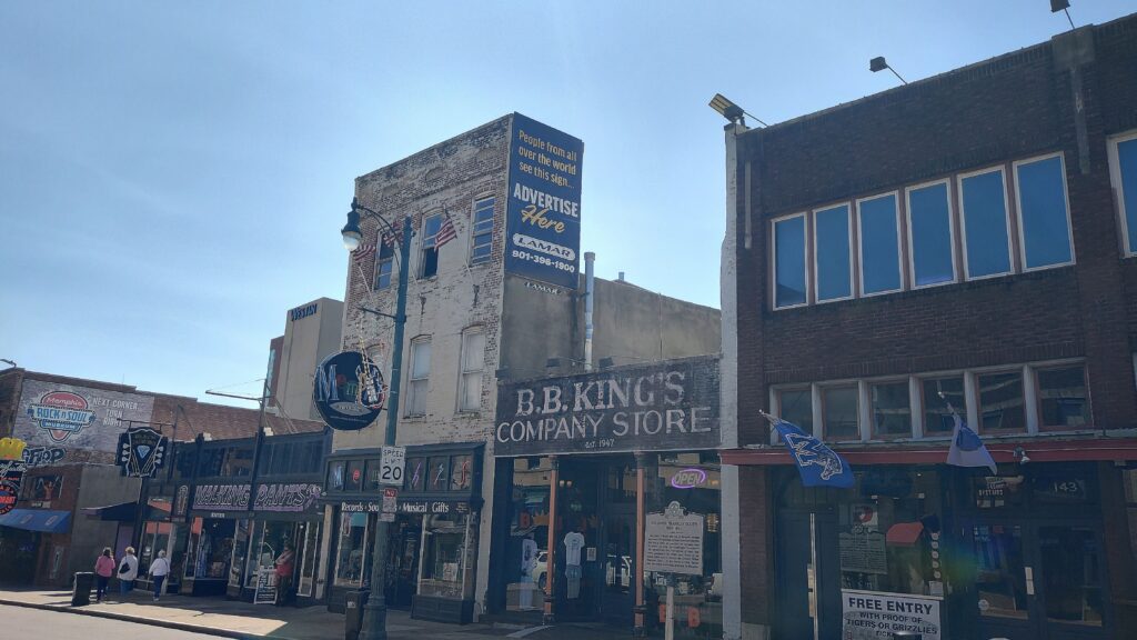 Just, it is deep brown waters mostly. Nicer to look at them boats by the wharf or those passing by which calmed me down nicely. Transport ships going north fighting against that massive flow. Then, I continued my walk alongside the riverfront across Tom Lee Park which is a welcoming community and touristy park free of charge that is also easily accessible. A fully enjoyable walk all across the riverfront is what I therefor clearly advise to arrive in town. Which also leads you close to that main road of town: head to Beale Street, the famous bar and blues music street. A vibing street forming main part of downtown with easy and walkable access to many must-sees nearby. Traffic has been thankfully blocked there and quickly I could spot signs that remind of legends like B.B. King and other legendary musicians. If you make your way up or down left or right in and around downtown, you will find those local joints for fresh food, coffee, creative drinks. In an old warehouse window front, I saw plenty of barrels waiting to be filled or emptied. The National Civil Rights Museum, many statues, other music museums or that FedEx Forum can be found in walking distance. Street art can be spotted here and there in sometimes random places across town, too.