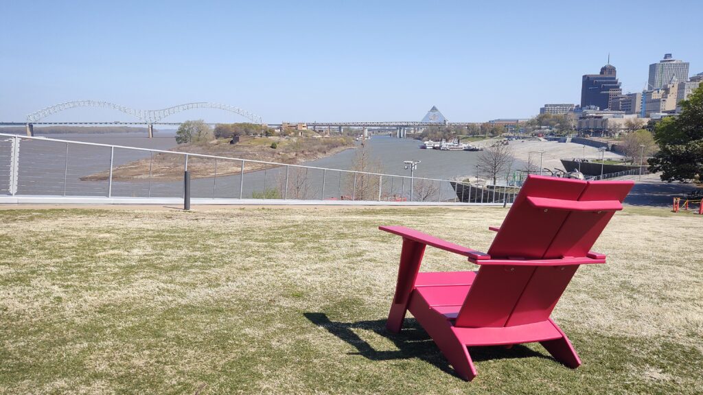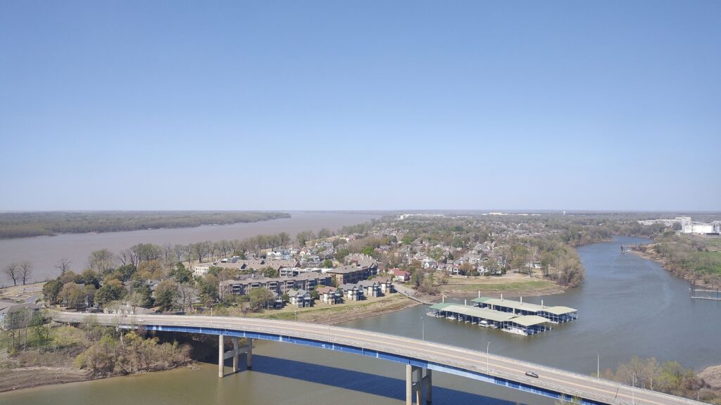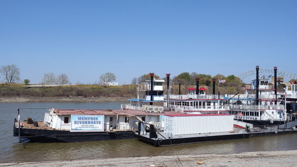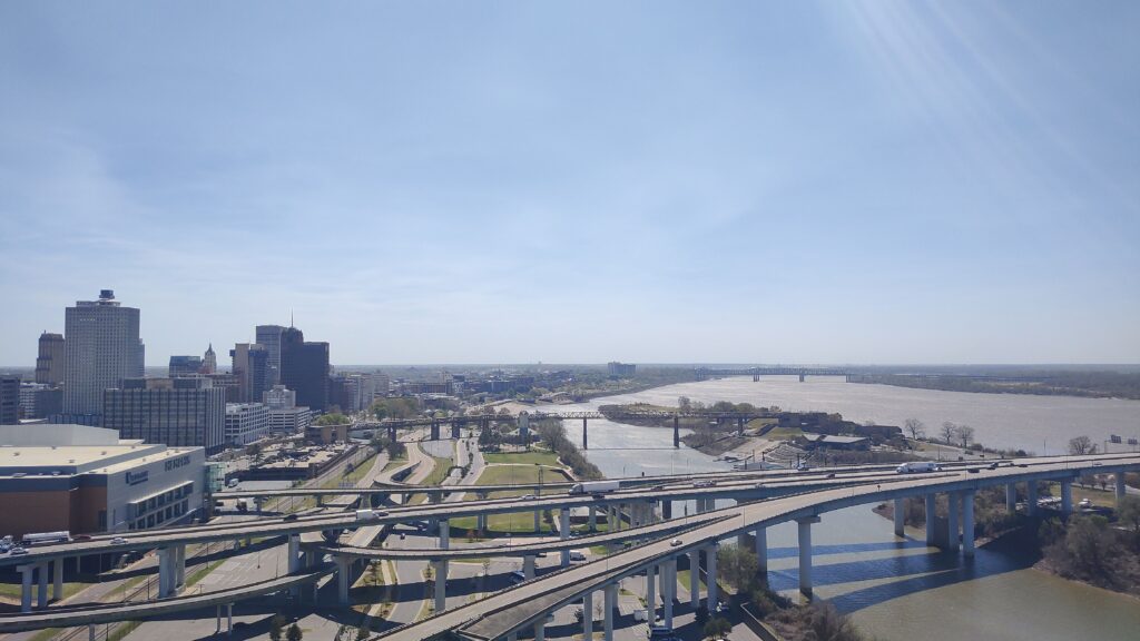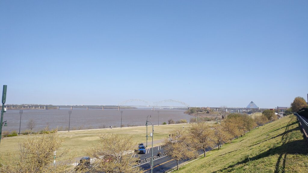 Memphis, Tennessee feels deep south even though it was my northernmost and thus starting point with this quick road trip. I flew in and out of Atlanta, Georgia, so I’ll skip on it to jump right away to the road trip destinations. Memphis’ population is for a significant part rather on that poor side and still the city tries hard to keep itself clean and to reduce the high crime rates it saw in the past. Well, I felt safe walking and exploring by myself during the day in all parts of and around downtown, but limited my activity at night time. With all my global & US travels, I have developed a certain gut feeling of how safe an environment might be and usually go along with that. I also recommend secured car parking overnight even though not at all intending to draw a negative picture of this soulful town. The weather was very mild to rather warm during my March of 2026 visit – and I heard that this was rather unusual for March. The Mississippi river provided fresh winds and a watery vibe on top of it all. The mighty Mississippi is one hell of a wide river and flows at a higher speed easily to be observed with the naked eye.